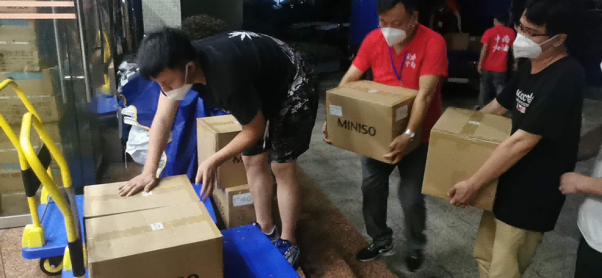 5月27日,名创优品向荔湾区捐赠价值100万元的矿泉水;6月4日,向海珠区捐赠价值50万元的医用隔离面罩10000个、橡胶检查手套100盒、一次性使用手术衣10000套。此外,名创优品先后向荔湾区龙津街道、白鹤洞街道捐赠充电宝、免洗洗手液、台灯、防蚊水、防晒帽等一大批应急物资,助力保障一线工作人员在执行疫情工作时的安全,为抗疫贡献力量。