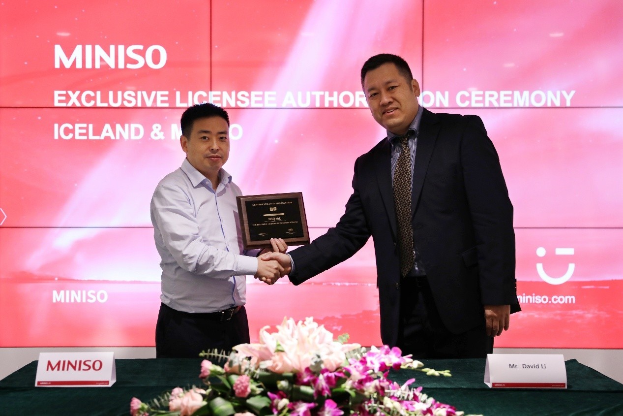 授权仪式,名创优品创始人叶国富先生(左)与冰岛市场总代理David Tong Li(右)